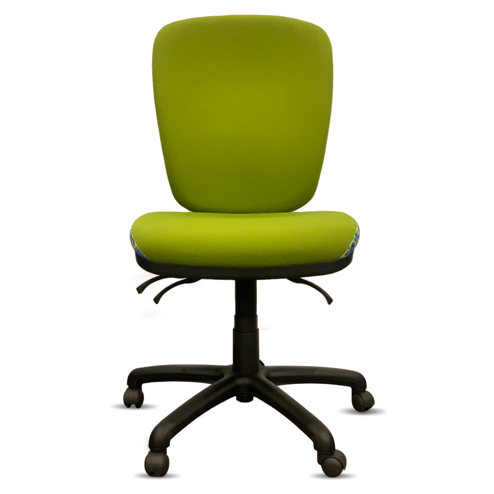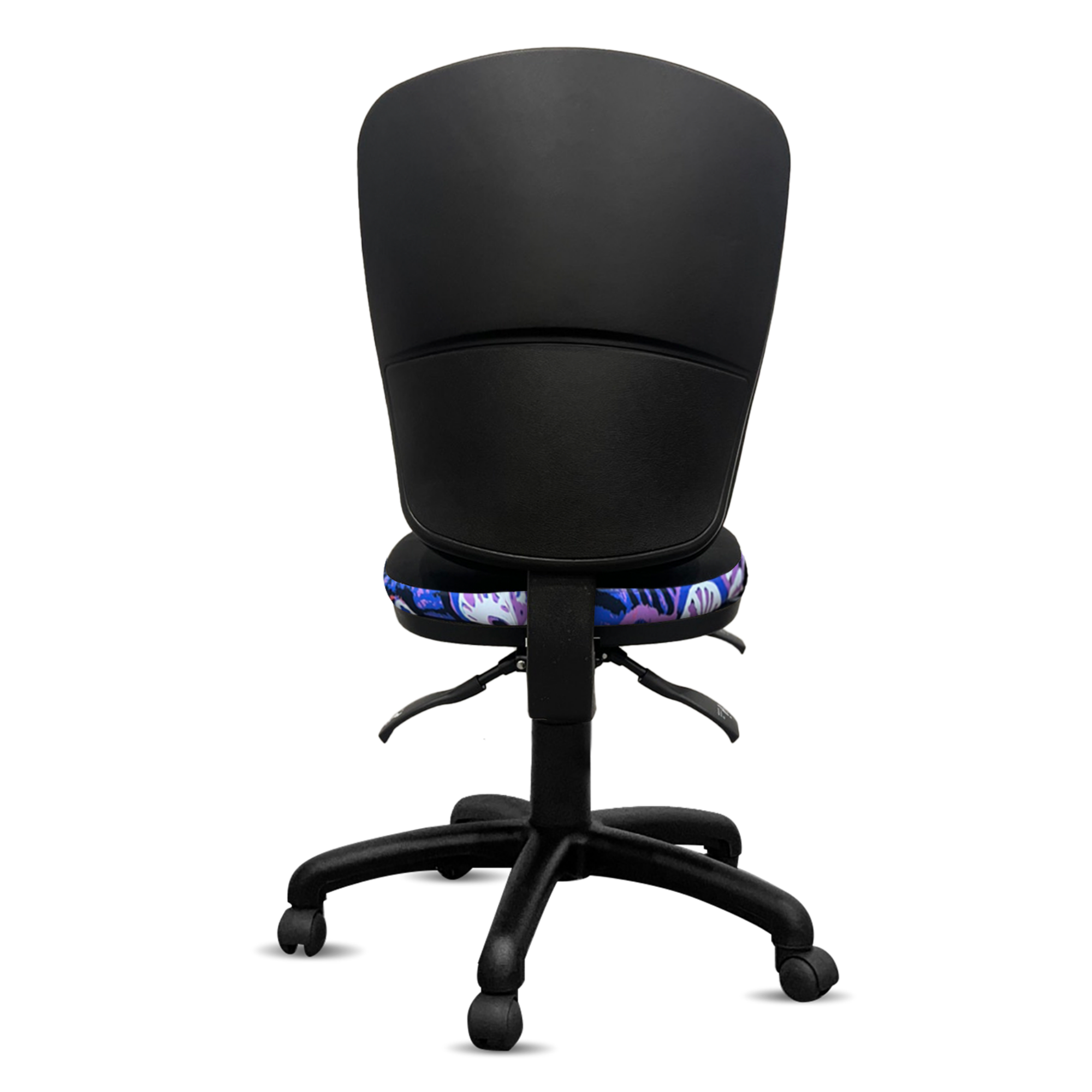 Office chair with 3 lever ergonomic mechanism upholstered in fabrics designed by Indigenous artists. Available in six black variations as well as red, orange, green, blue and grey.