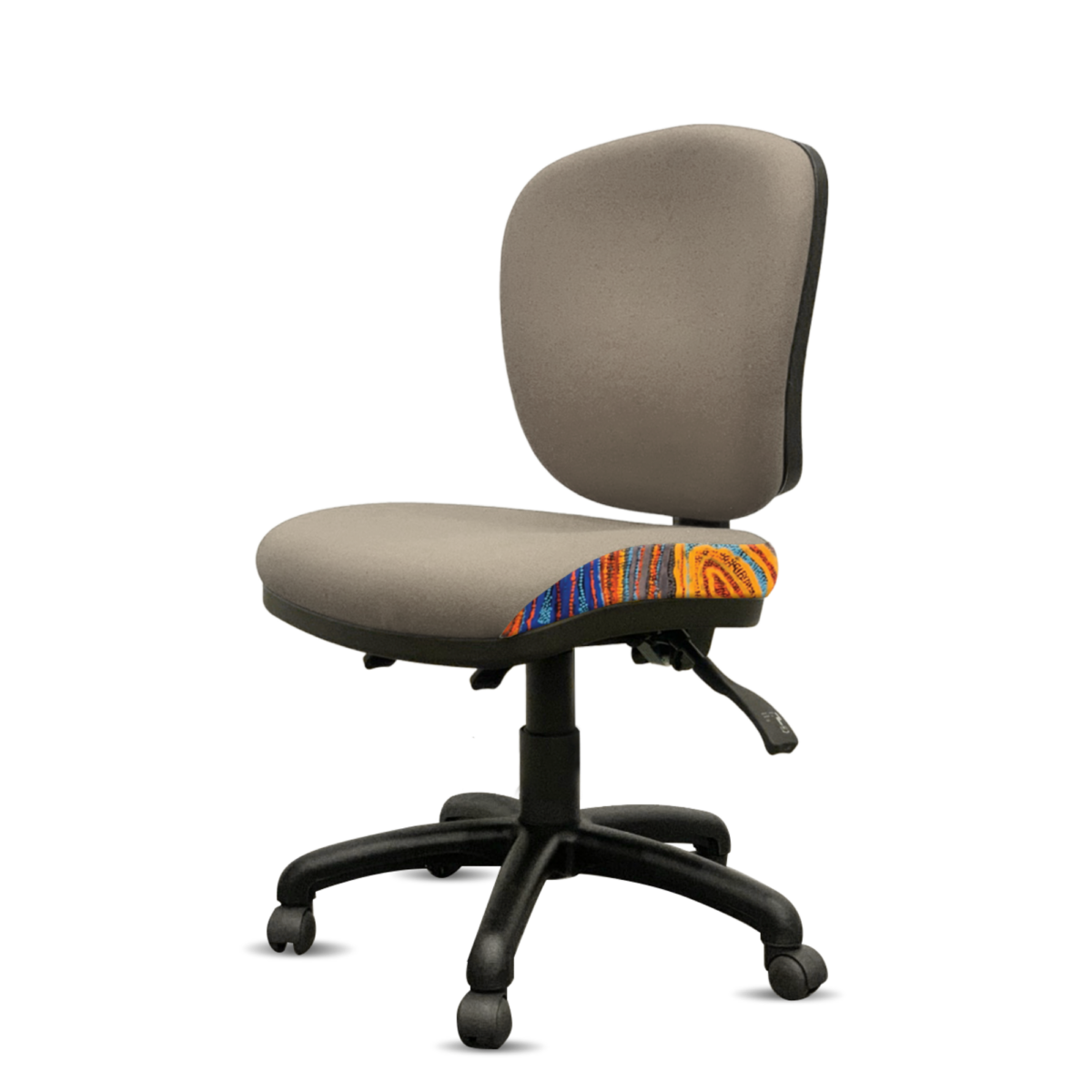 Office chair with 3 lever ergonomic mechanism upholstered in fabrics designed by Indigenous artists. Available in six black variations as well as red, orange, green, blue and grey.