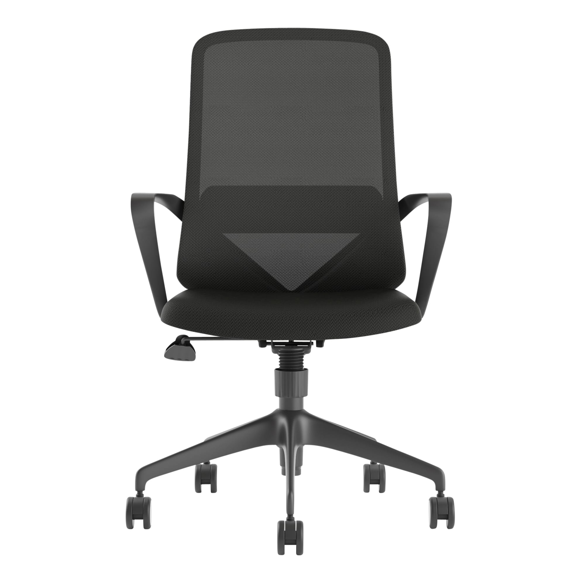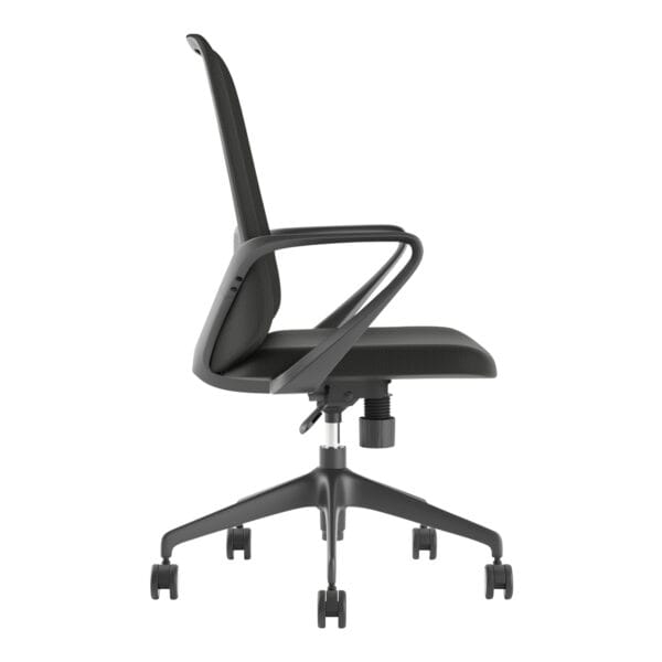 Black office chair with synchro mechanism and fixed arms.
