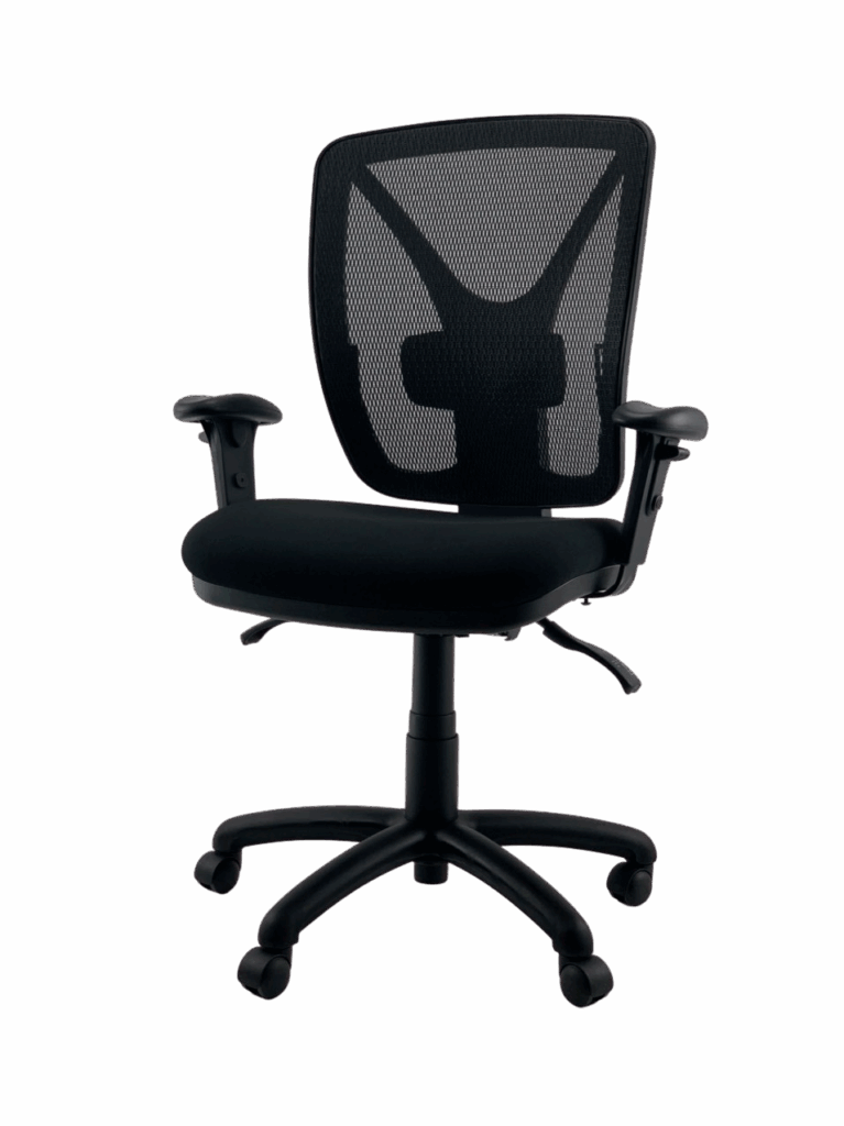 Black ergonomic chair with three lever mechanism available in fabric or PU.