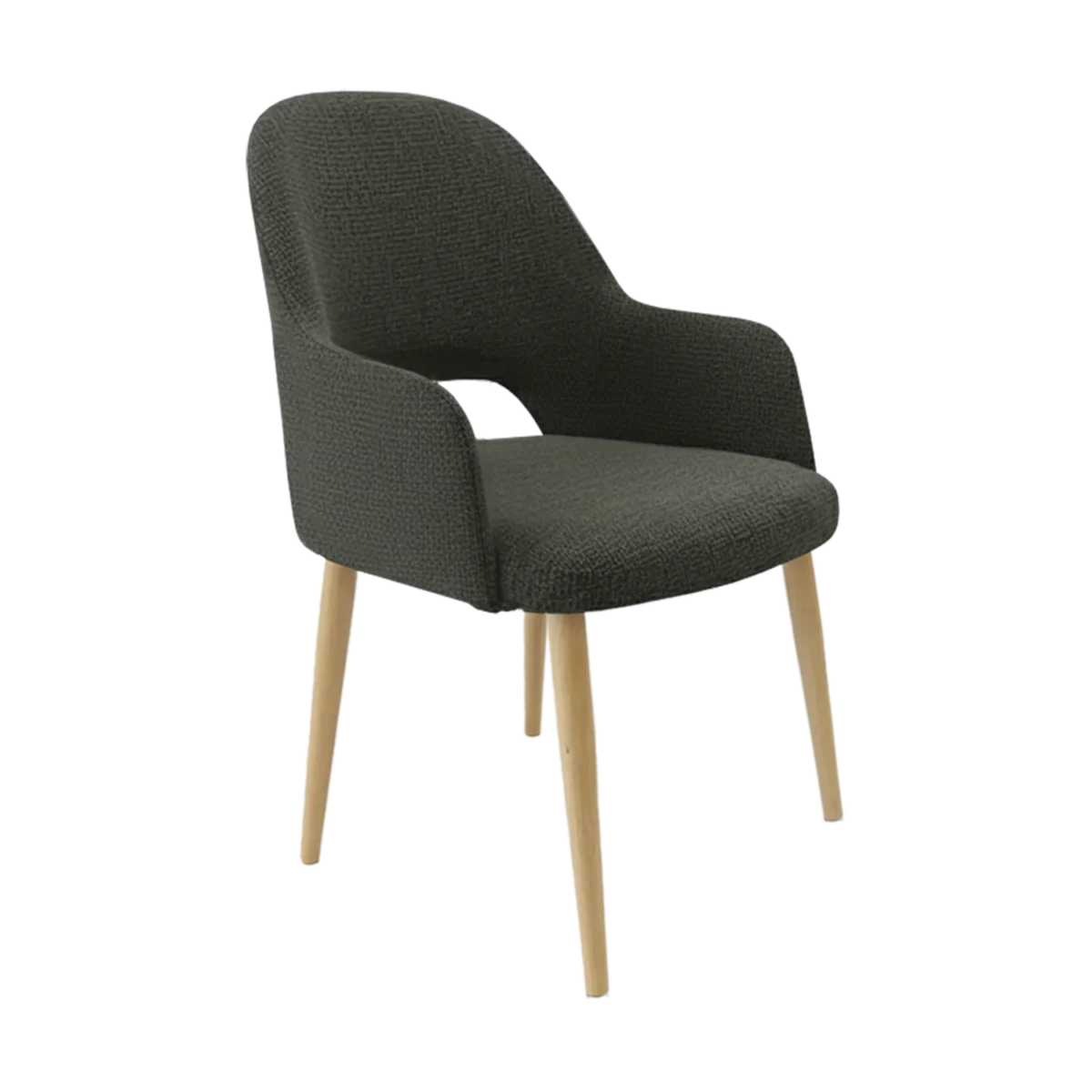 Upholstered armchair available in anthracite fabric, tan, mocha or charcoal suede or black, nougat or stone vinyl with sled or four leg base.