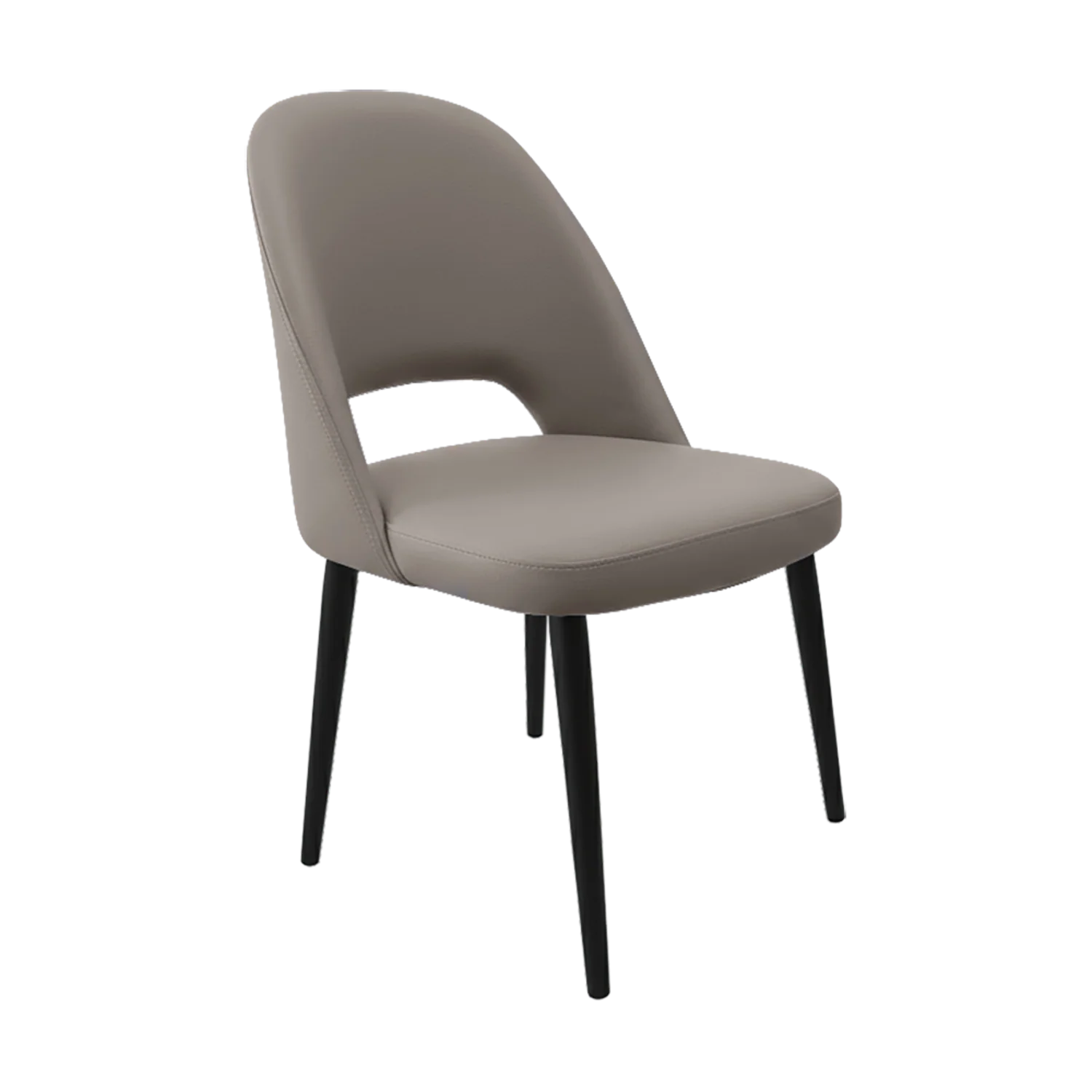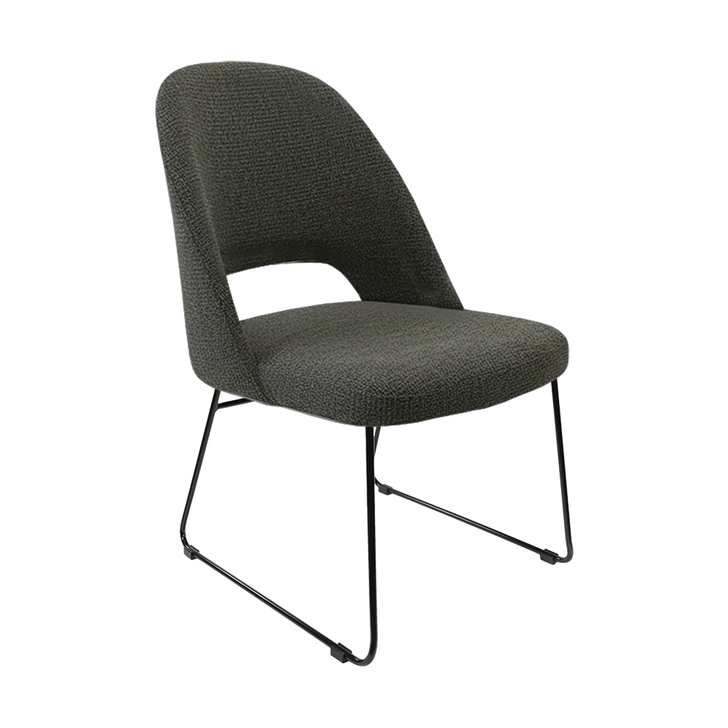 Upholstered armchair available in anthracite fabric, tan, mocha or charcoal suede or black, nougat or stone vinyl with sled or four leg base.