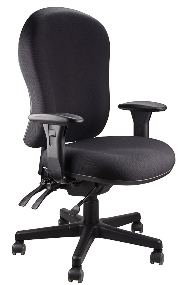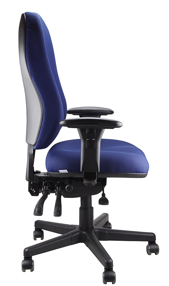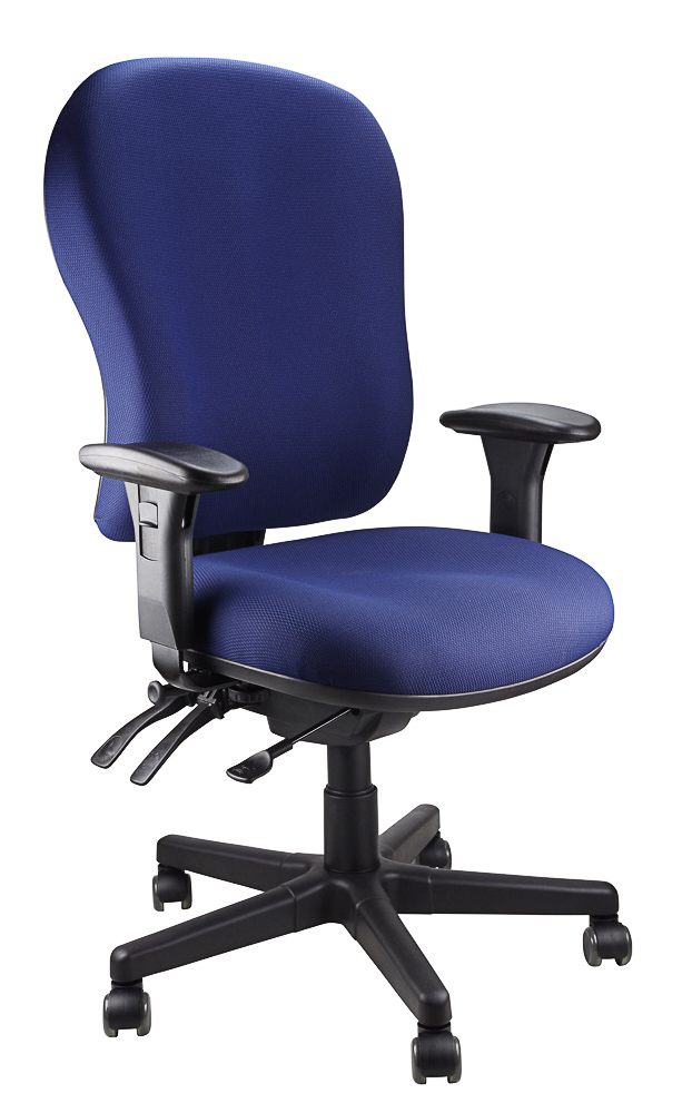 Upholstered ergonomic chair with 4-lever mechanism available in black or navy.