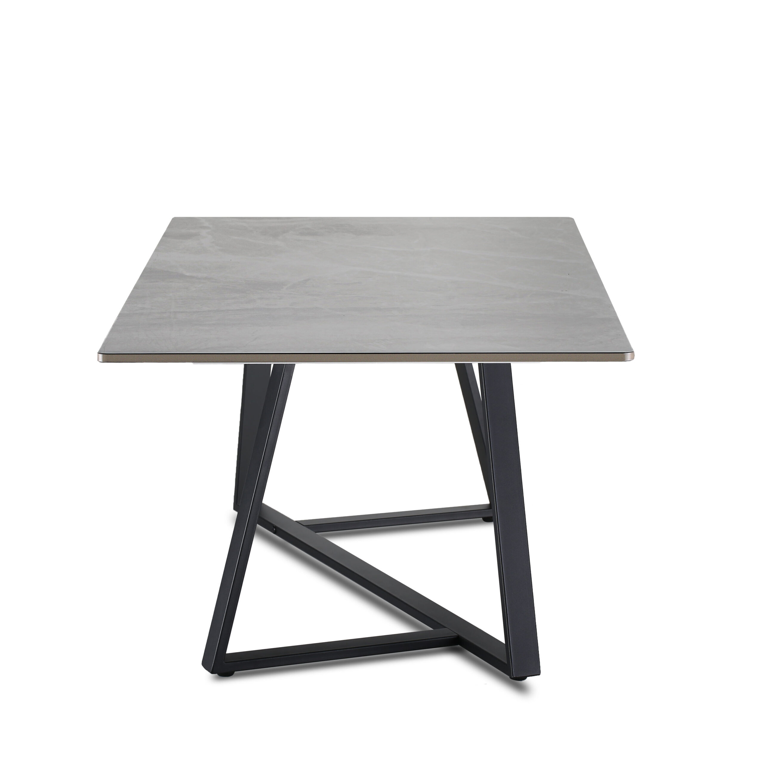 Coffee table with grey Carrara marble top sintered stone top and black powdercoat base.