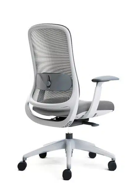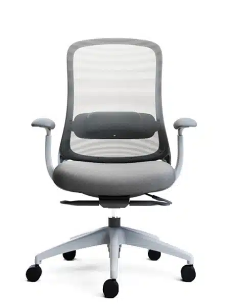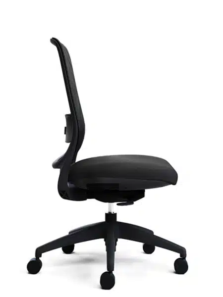 Office chair with synchro mechanism available in black or light grey with optional arms.