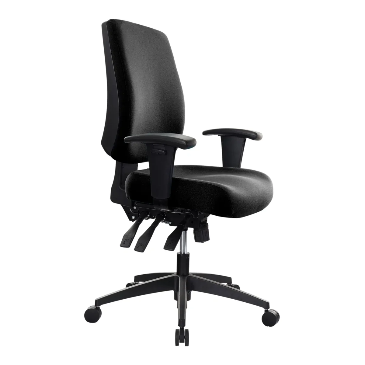 Medium back upholstered ergonomic chair with 4-lever mechanism available in black or teal.