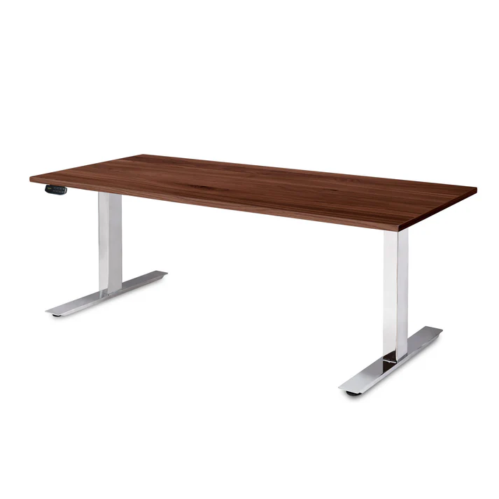 Electric sit stand desk with Walnut top, available with black, white or chrome frame.